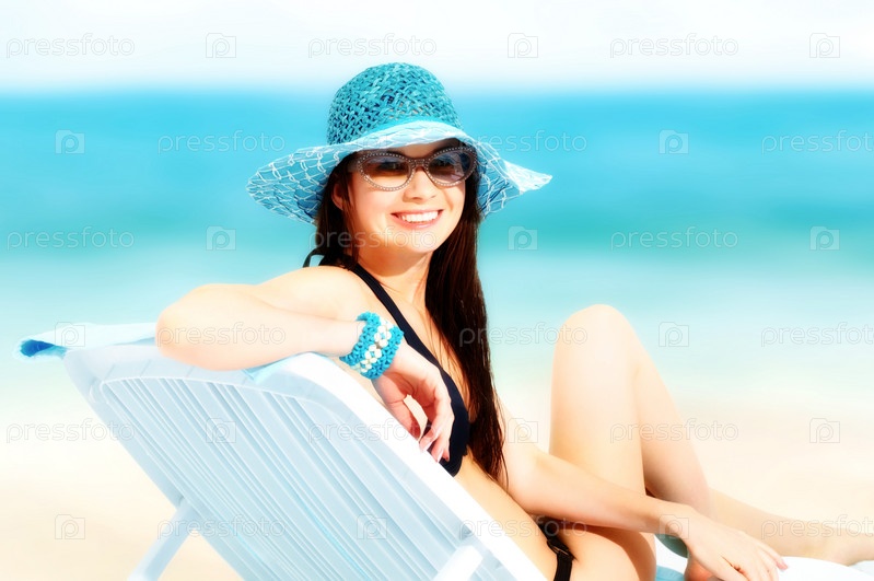 Улыбающаяся девушка в шляпе сидит в шезлонге на пляже