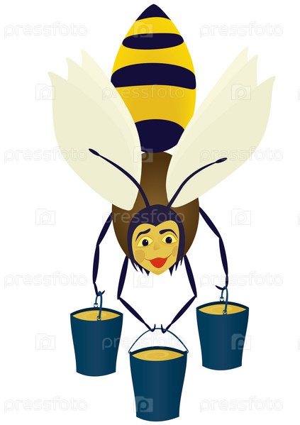 Иллюстрация летящей пчелы с ведрами меда на белом фоне