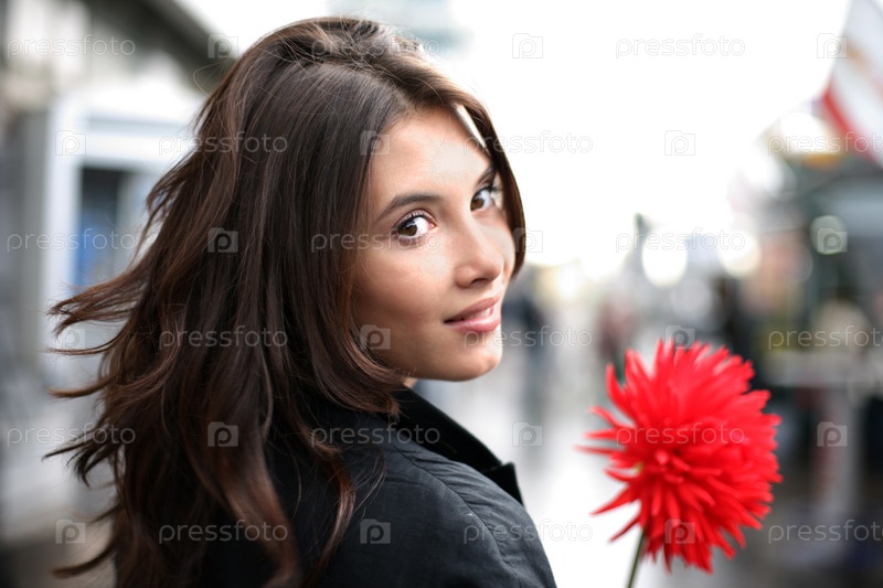 Красивая брюнетка с красным цветком идет по улице и оборачивается назад