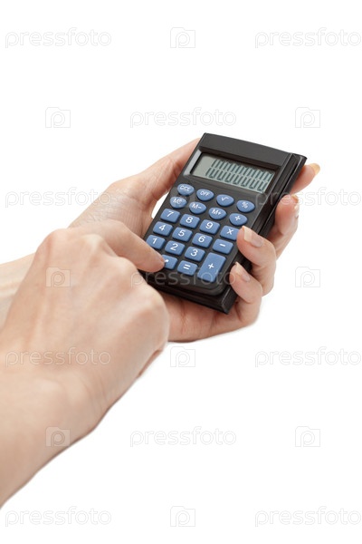 Калькулятор в женской руке, изолированной на белом фоне