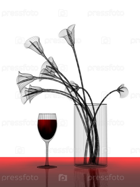 Букет лилий в вазе и бокал красного вина. Иллюстрация