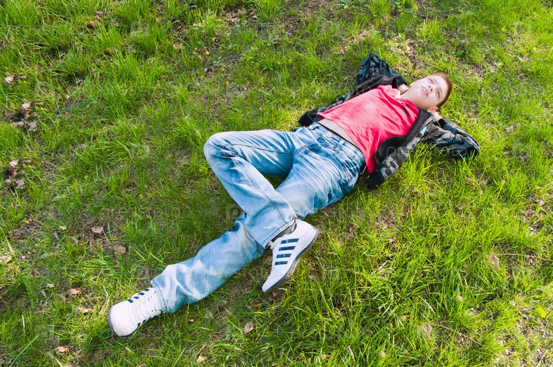 Молодой парень лежит на траве
