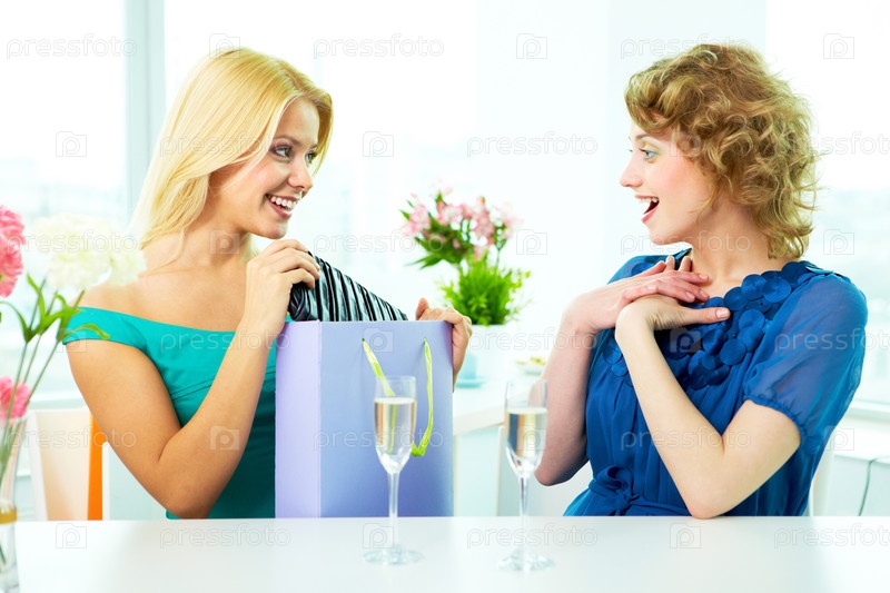 Именинница принимает подарок от подруги