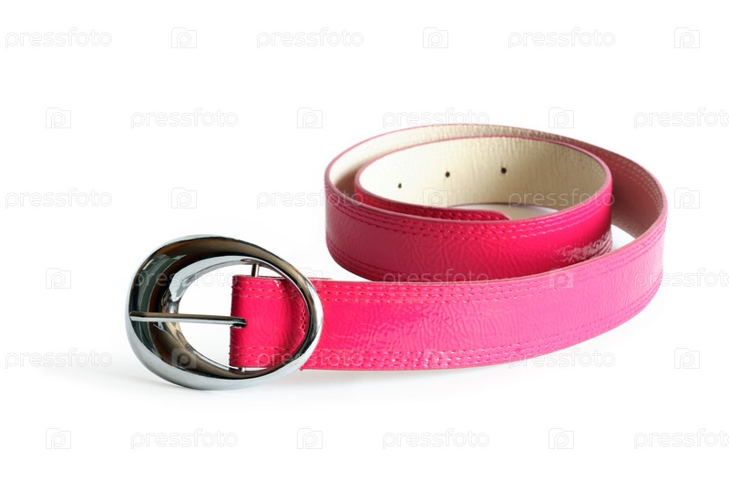 Розовый ремень с металлической пряжкой на белом фоне