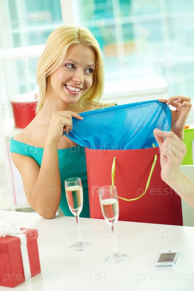 Блондинка показывает подарок, вытащив его из пакета
