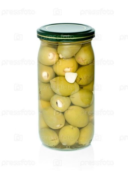 Стеклянная банка с маринованными оливками, фаршированными чесноком. Белый фон
