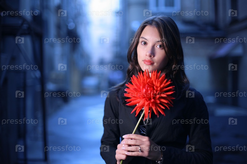 Портрет красивой молодой женщины с красным цветком георгина