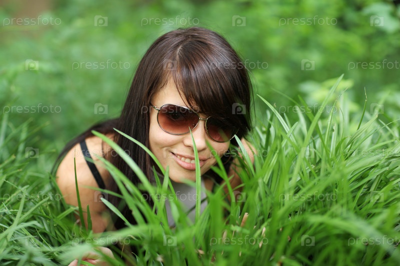 Улыбающаяся девушка в солнцезащитных очках лежит в траве