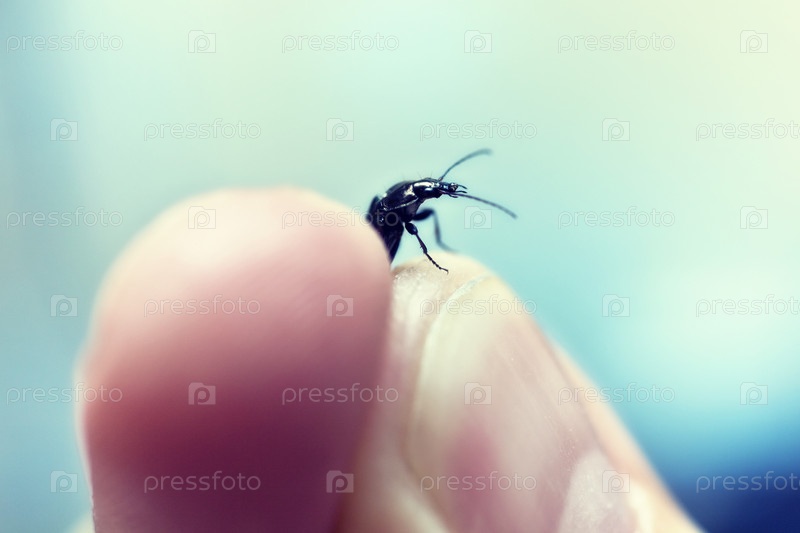 Человеческие пальцы держат черного жука, крупный план