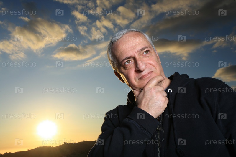 Задумавшийся мужчина преклонного возраста на фоне заката