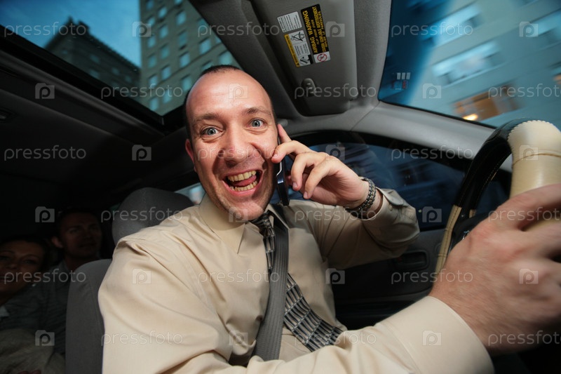 Бизнесмен ведет машину и разговаривает по мобильному телефону
