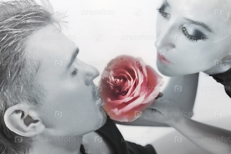 Портрет мужчины и женщины с серебряной краской на лице, нюхающих цветок розы