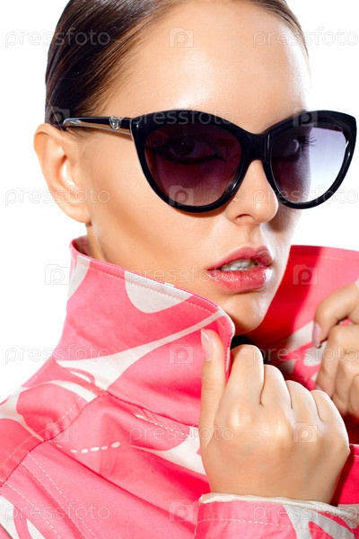 Портрет модной женщины в солнцезащитных очках, на белом фоне