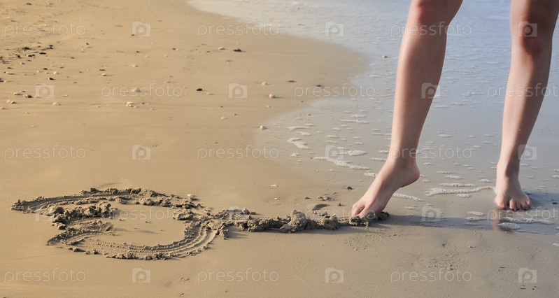 Абстрактное изображение ноги, рисующей сердце в пляжном песке