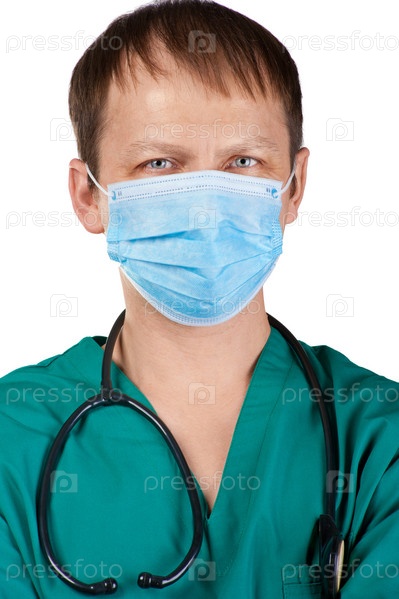 Портрет врача в маске со стетоскопом крупным планом, на белом фоне