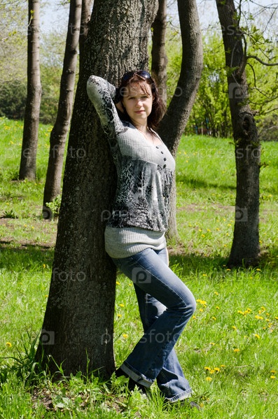 Женщина позирует в парке возле дерева