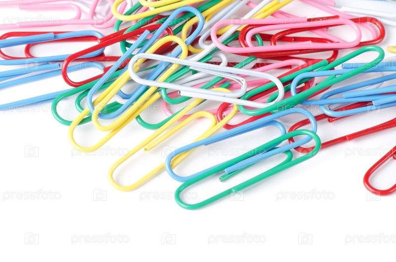 Разноцветные скрепки на белом фоне