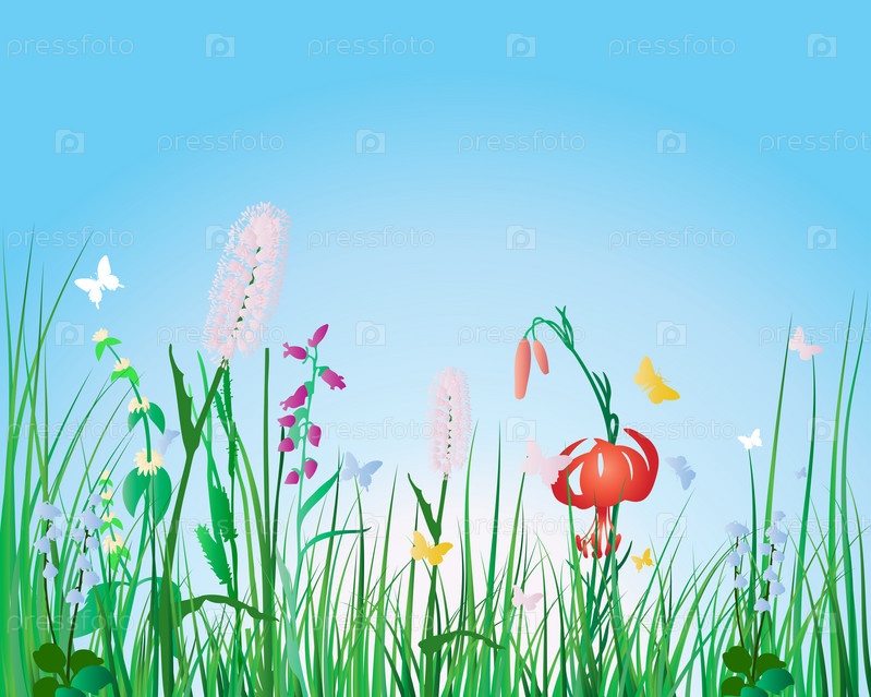 Трава и полевые цветы на голубом фоне