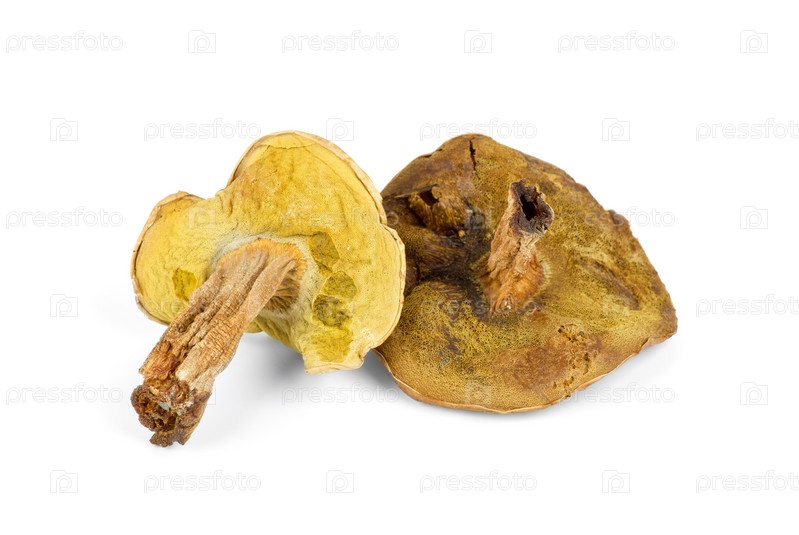 Два сушеных белых гриба на белом фоне