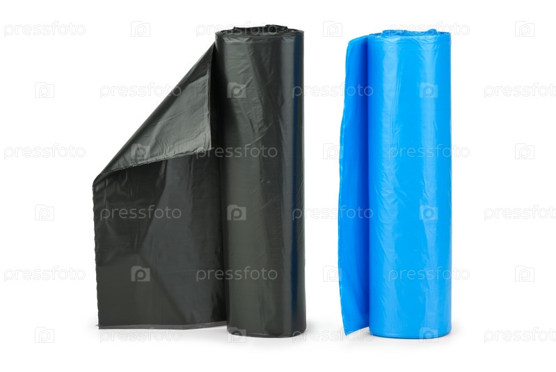 Рулоны синих и черных мусорных пакетов на белом фоне