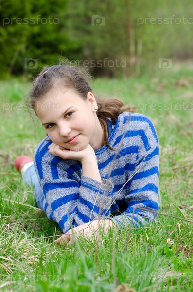 Девочка-подросток лежит на поляне в лесу