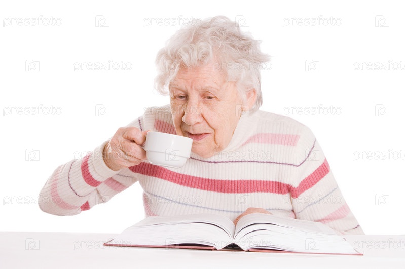 Пожилая женщина пьет кофе, изолирована на белом фоне