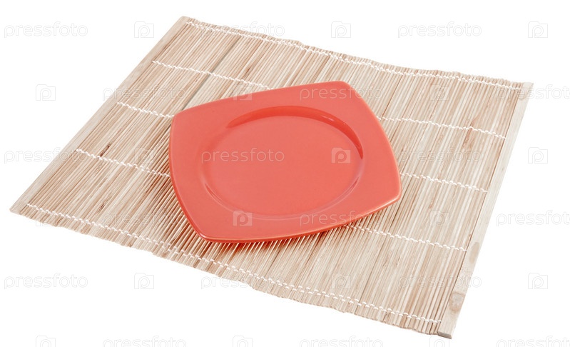 Пустые блюда белые и деревянные палочки на японской скатерти