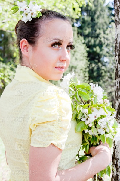 Портрет молодой улыбающейся девушки с цветущей веткой яблони