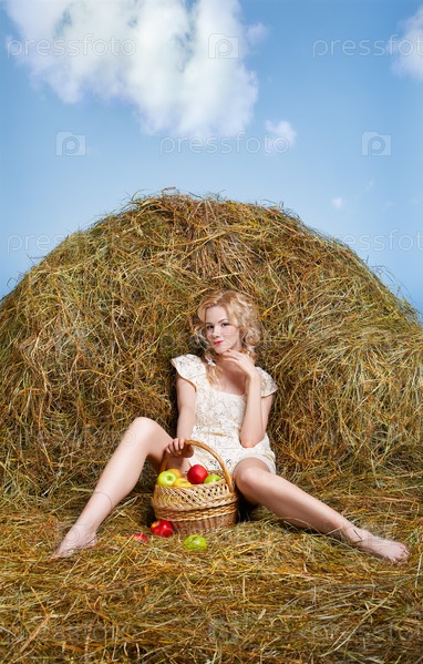 Портрет молодой девушки, сидящей возле стога сена с корзиной яблок