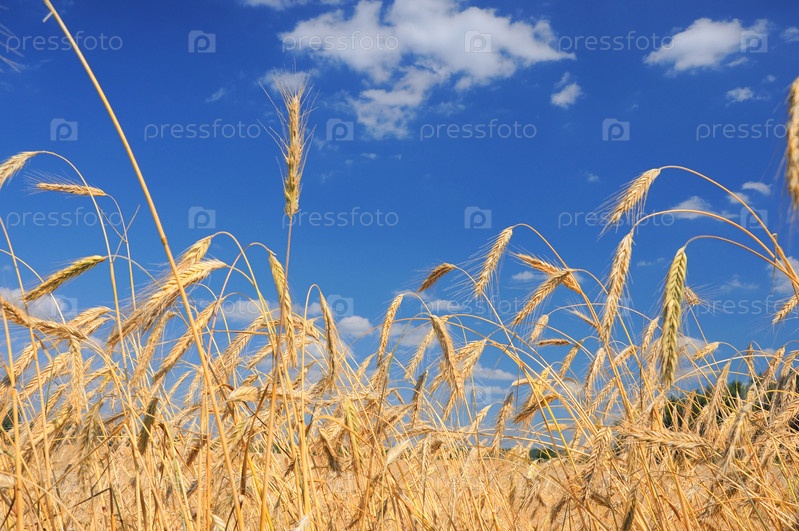 Золотые пшеничные уши с голубым небом над ними