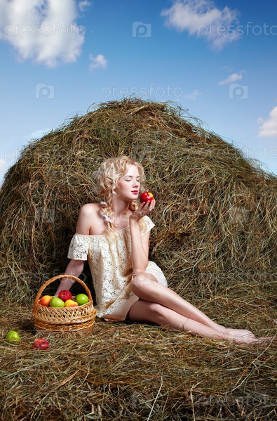 Портрет молодой девушки, сидящей возле стога сена с корзиной яблок