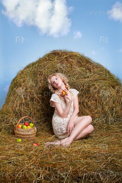 Портрет молодой девушки, сидящей возле стога сена с корзиной яблок