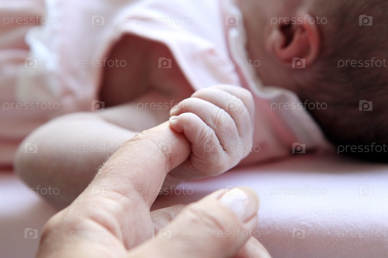 Младенец держится за руку матери