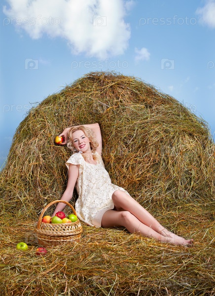 Портрет молодой девушки, сидящей возле стога сена с корзиной яблок