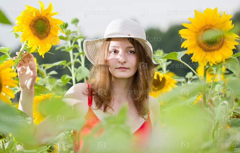Девушка стоит среди подсолнухов