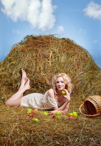 Портрет молодой девушки, лежащей на стоге сена с корзиной и яблоками