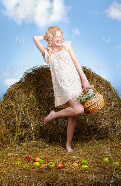 Портрет молодой девушки, стоящей на стоге сена с корзиной на фоне голубого неба