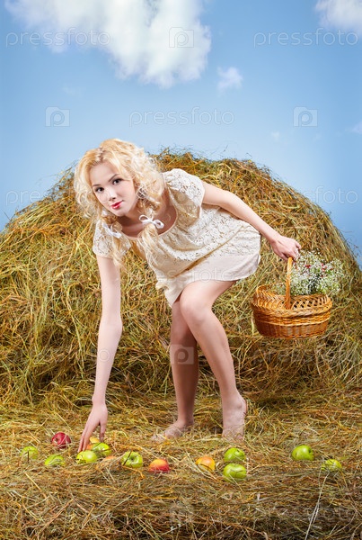Портрет молодой девушки, собирающей яблоки в корзину на стоге сена