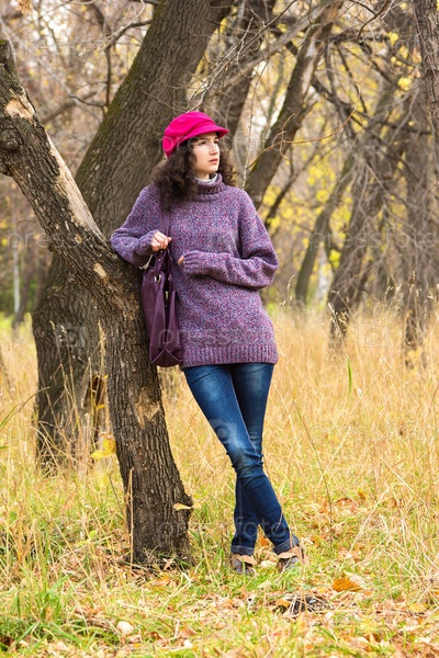 Молодая стильная женщина с большой сумкой в осеннем парке