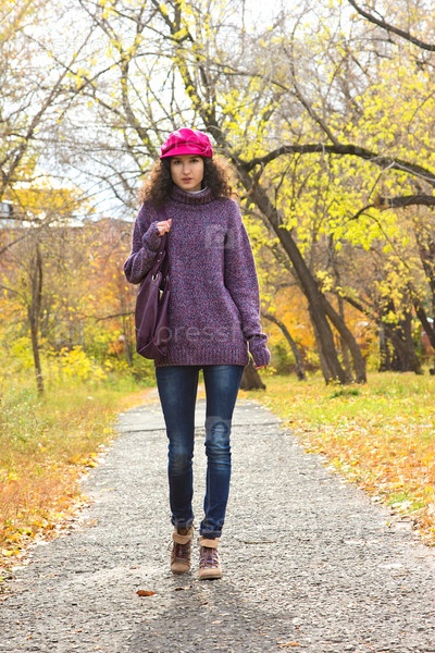 Молодая стильная женщина с большой сумкой в осеннем парке