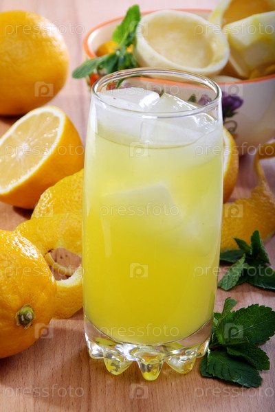 Лимоны и свежевыжатый сок с кубиками льда