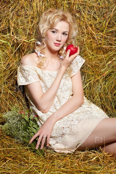 Портрет молодой девушки, сидящей на стоге сена с яблоком в руке