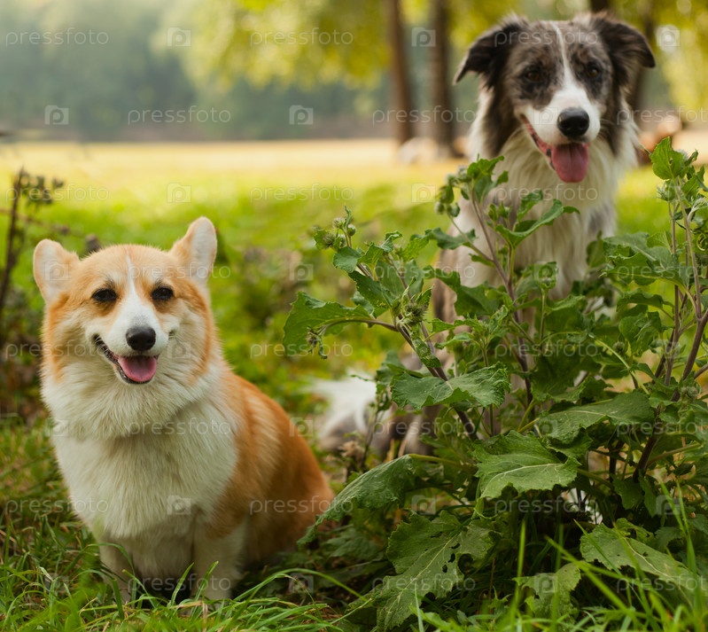Две собаки в парке. Вельш корги и бордер-колли