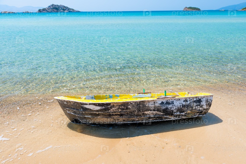 Красивое бирюзовое море и старая лодка на берегу