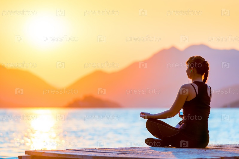 Девушка в позе лотоса на пирсе
