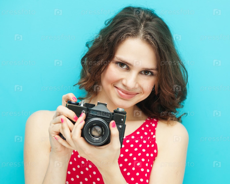 Красивая девушка со старинным фотоаппаратом