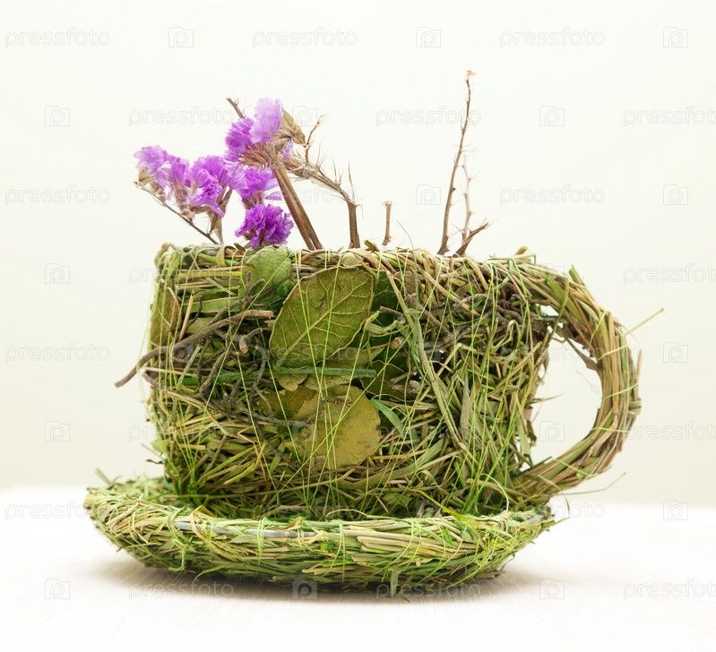 Кружка, украшенная травой и листьями