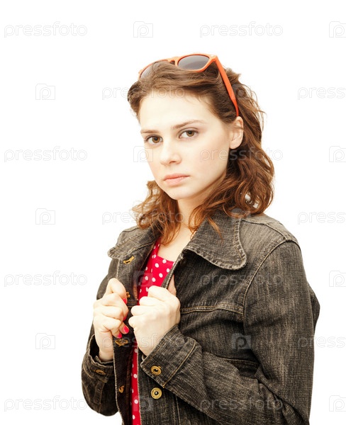 Красивая молодая женщина в джинсовой куртке с солнцезащитными очками, изолированная на белом фоне
