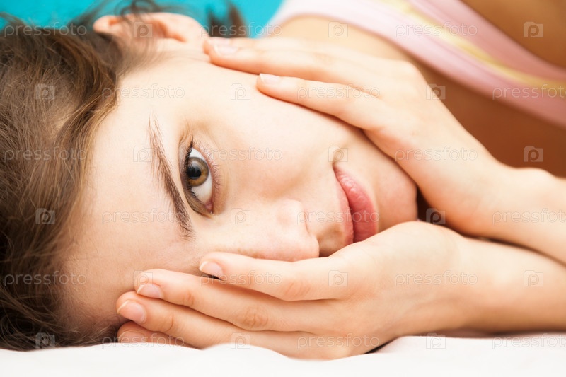 Красивая молодая женщина лежит на кровати и смотрит в камеру
