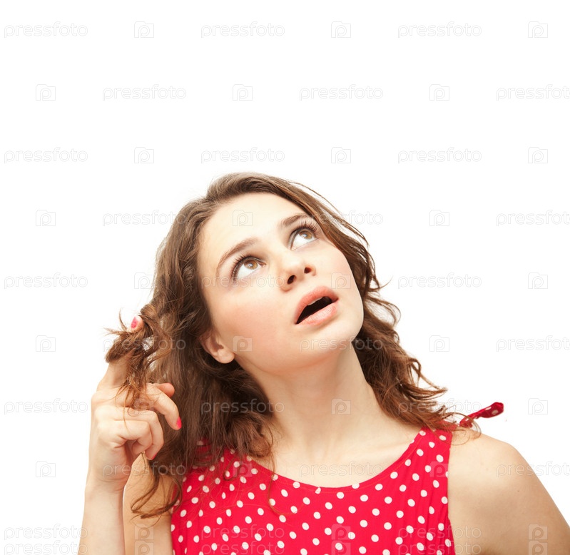 Молодая красивая женщина в красной блузке, изолированная на белом фоне